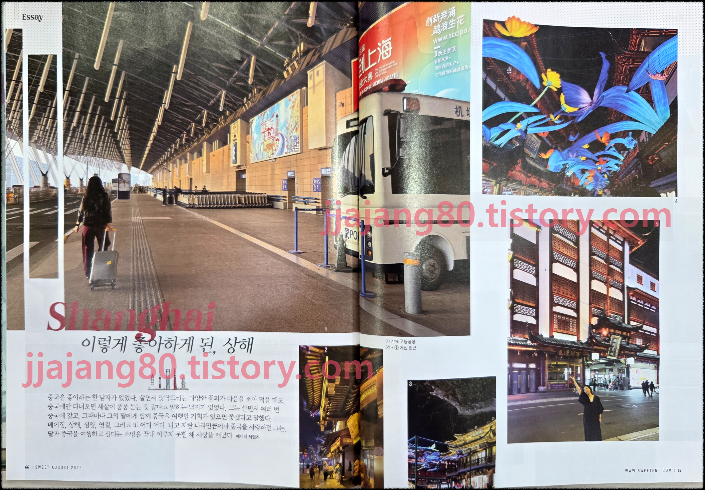 사실 눈에 들어온 내용은 `25 8월호 중에서 "이렇게 좋아하게 된 상해"라는 에세이이다. 사실 잡지라는 분류에 걸맞게 에세이보다는 포토북에 가까운 짤막한 글이었지만, 에디터의 아버지가 어떤 분이셨는지, 여행을 간 자신은 어떤 마음일까, 그리고 중국에 대해 어떻게 묘사할까 가 궁금했다. 감각적인 사진들과 중국에서의 일상을 보며 새삼 나에게도 여행자로서의 호기심과 긴장감을 다시 점화할 마음을 갖게 되었다.