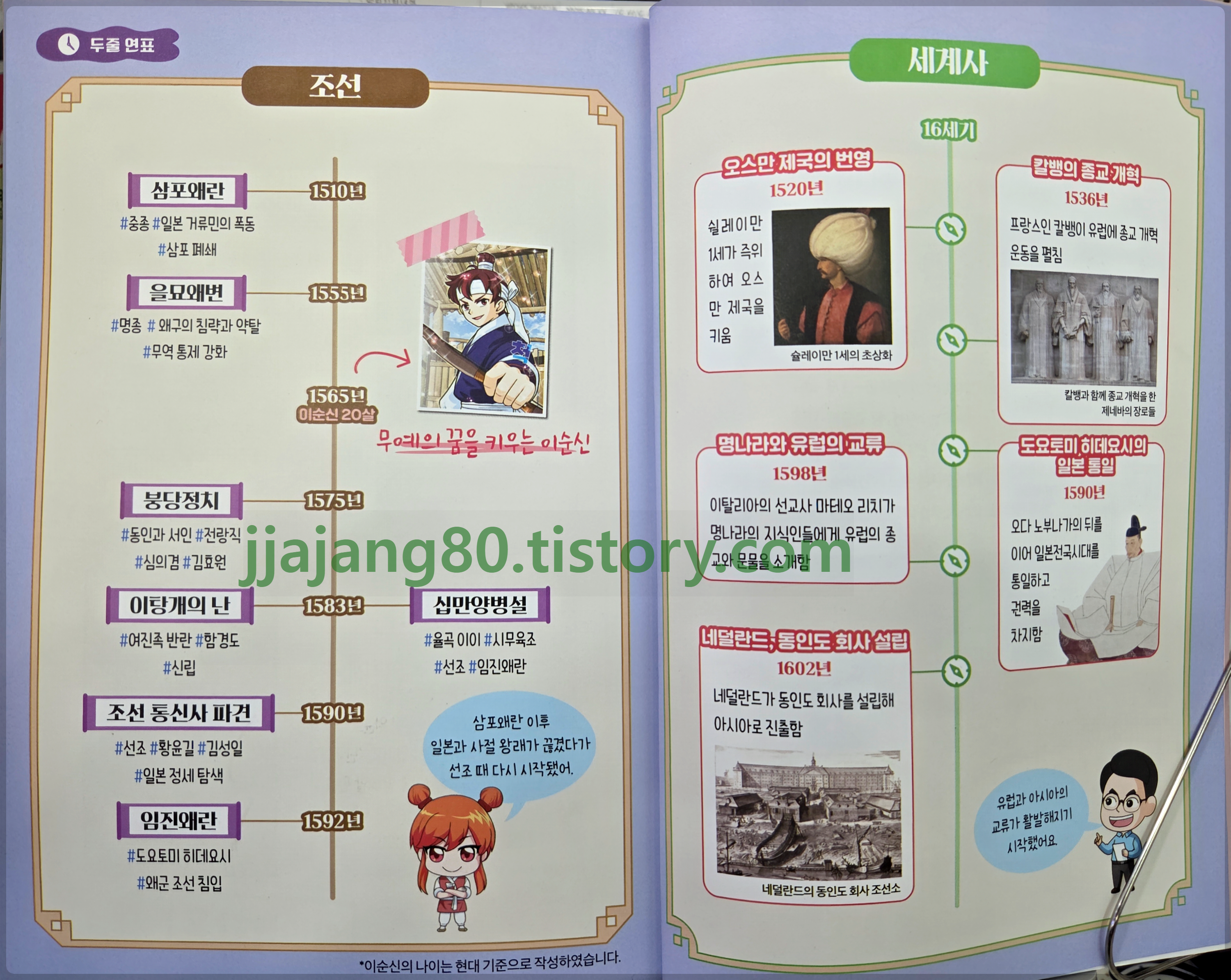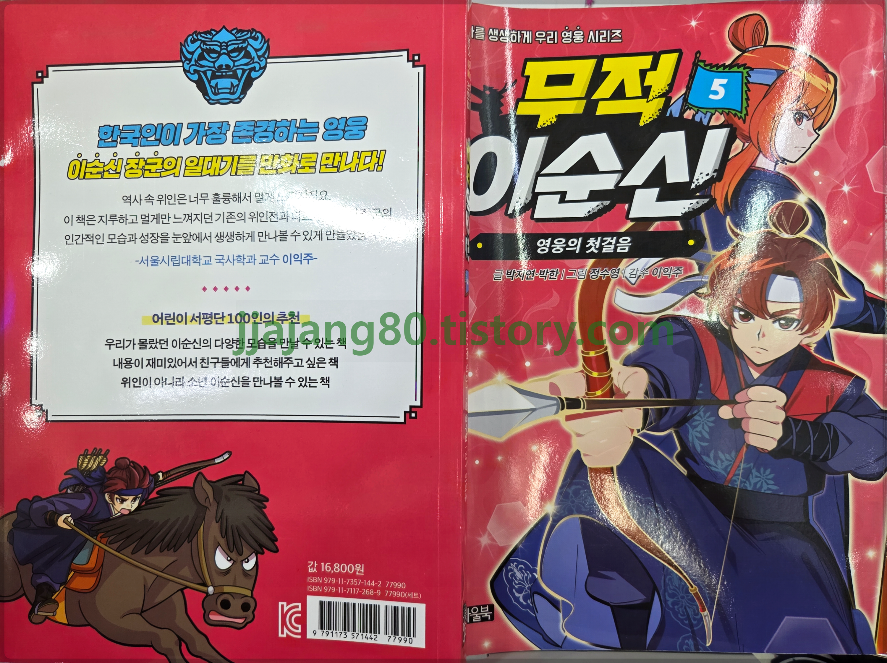 진실과 허구를 넘나드는 어린이 역사 위인 만화 [무적 이순신] 5권이 출간되었다. 이번 다섯 번째 이야기에서는 이순신과 방수진의 결혼이야기를 시작으로 무관이 되어 영웅으로의 첫걸음을 내딛고자 하는 순신의 에피소드가 소개된다. 주요 주인공인 '이순신'과 '방수진' 그리고 '이 회'와 '방진'은 실제 했던 인물이지만 무과 시험의 참가자인 '성윤길'과 순신의 말타기 스승으로 소개되는 '원연'은 이 시리즈에서 만들어진 창작 캐릭터이다. 장인인 방진과 서애 유성룡과의 만남은 이순신이 무관으로의 길을 선택하게 된 결정적인 계기가 되고 차근차근 무관으로 성장하는 과정을 겪게 된다. 특히 무과 시험 중 말타기 과목에서 낙방한 일화는 어렸을 적부터 잘 알고 있는 사실이지만 '성윤길'이란 인물의 방해로 떨어진 것은 너무 극화시킨 것은 아닌지 생각된다. 이야기를 타인과의 경쟁보다 자신의 정신적 인내에 좀 더 치중했으면 어땠을까 하는 아쉬움이 남는다. 무과 시험에서 낙마한 이후의 이야기는 다음 권으로 이어지고 있어 더욱 흥미진진하게 기대된다. 책의 끝부분에 이순신 생애의 세계사적 주요 사건이 쓰여 있어서 당시의 조선과 세계사의 역사를 비교해 볼 수 있는 것이 매우 유익했다. 6권을 기대하며 같이 이순신 영웅전에 몰입해 보길 권한다.